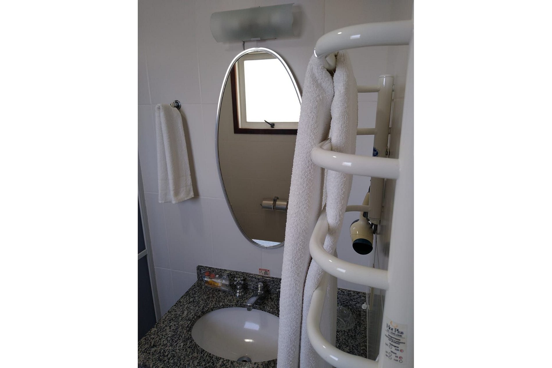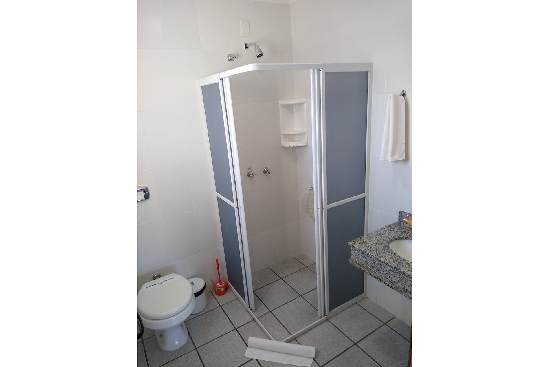 Quarto na praia! Comodidade de um quarto com ar condicionado, frigobar e TV Smart e banheiro com secador de cabelos e toalheiro térmico.